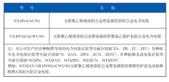 緊壓絞合鋁合金導(dǎo)體、阻燃交聯(lián)聚乙烯絕緣、軋紋聚酯帶繞包、鋁合金帶連鎖鎧裝護(hù)套、5000V及以上采用內(nèi)、外屏蔽層。